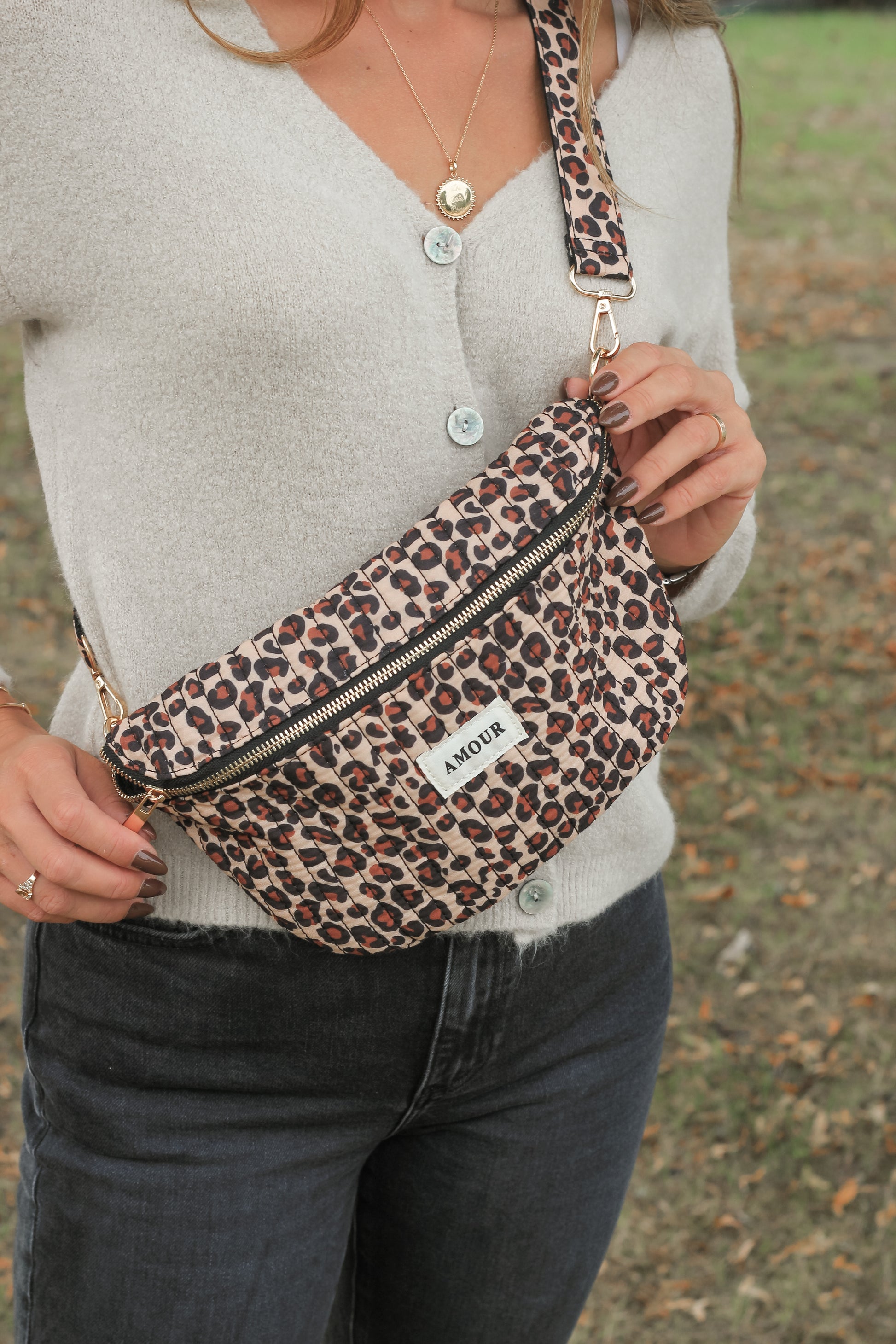 Sac banane épaule avec inscription amour, parfait pour avoir tout à porter de mains.