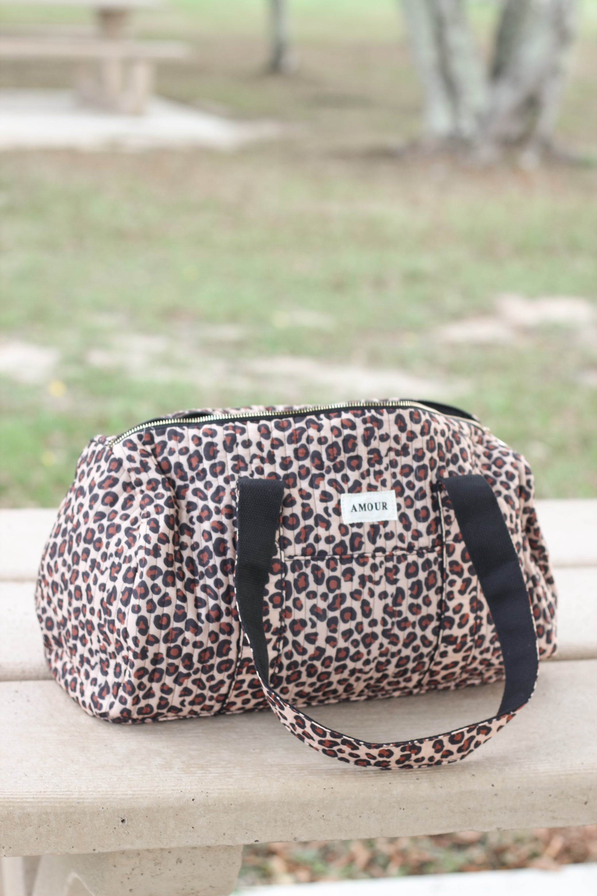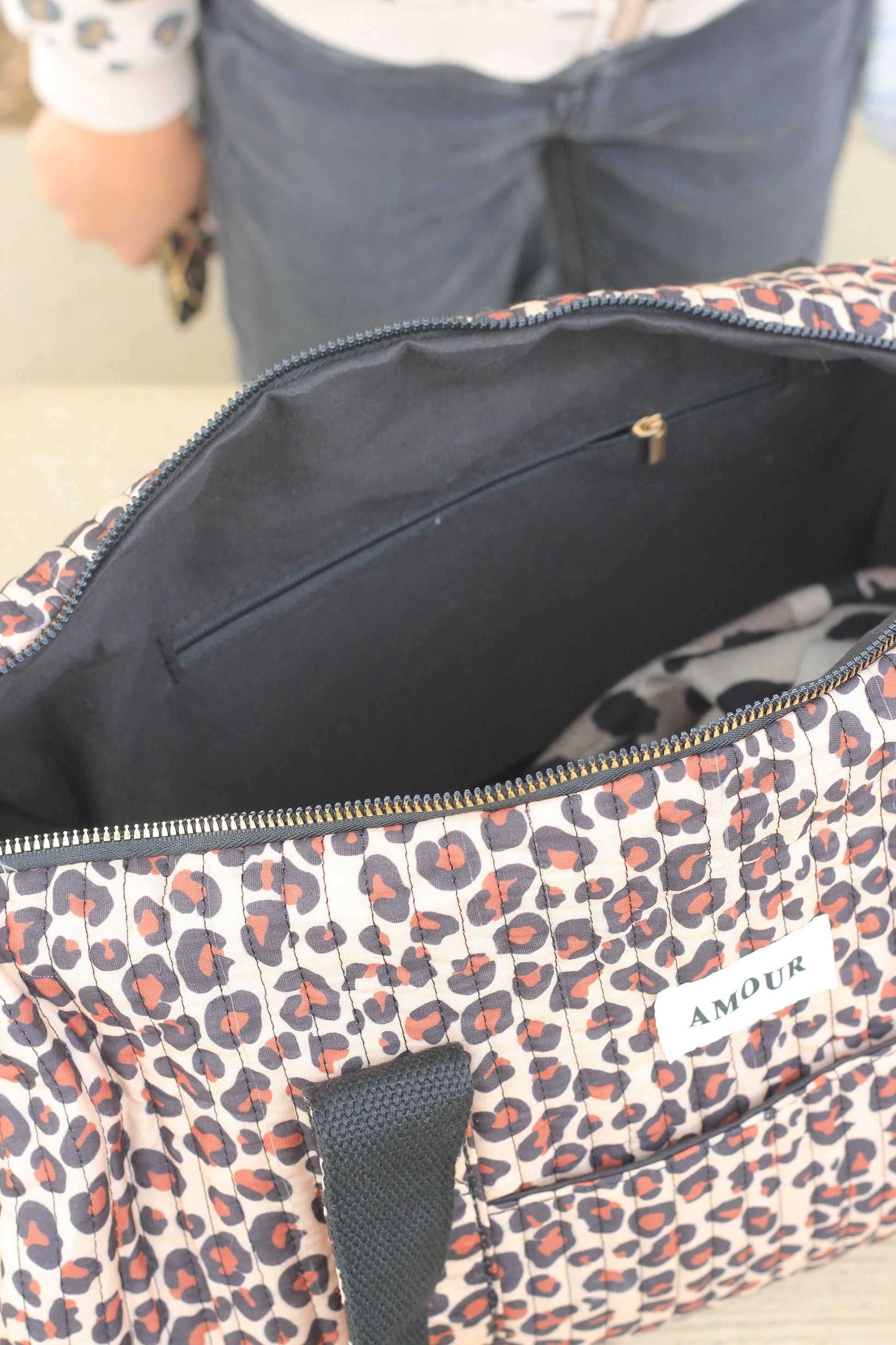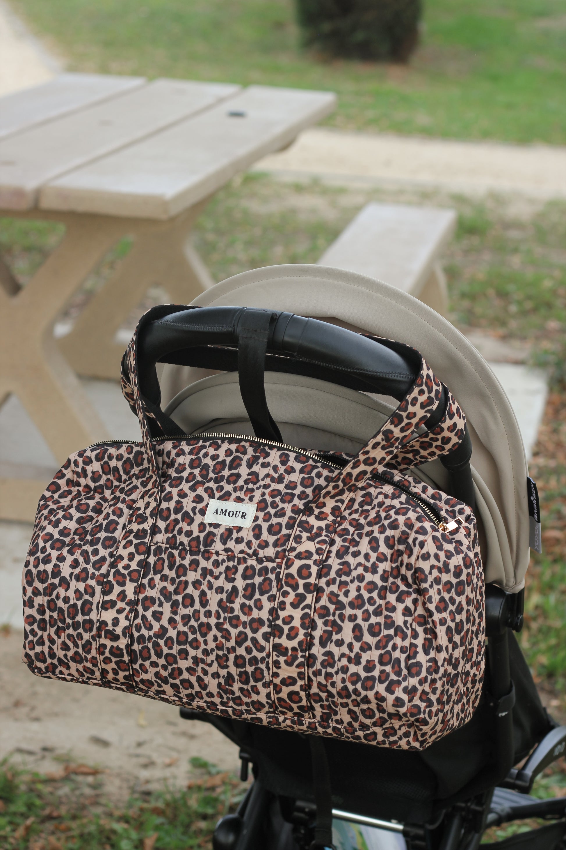 Le sac léopard avec inscription amour, parfait pour les sorties en famille ou pour ranger ses affaires lors du séjour à la maternité ou même comme sac à langer!