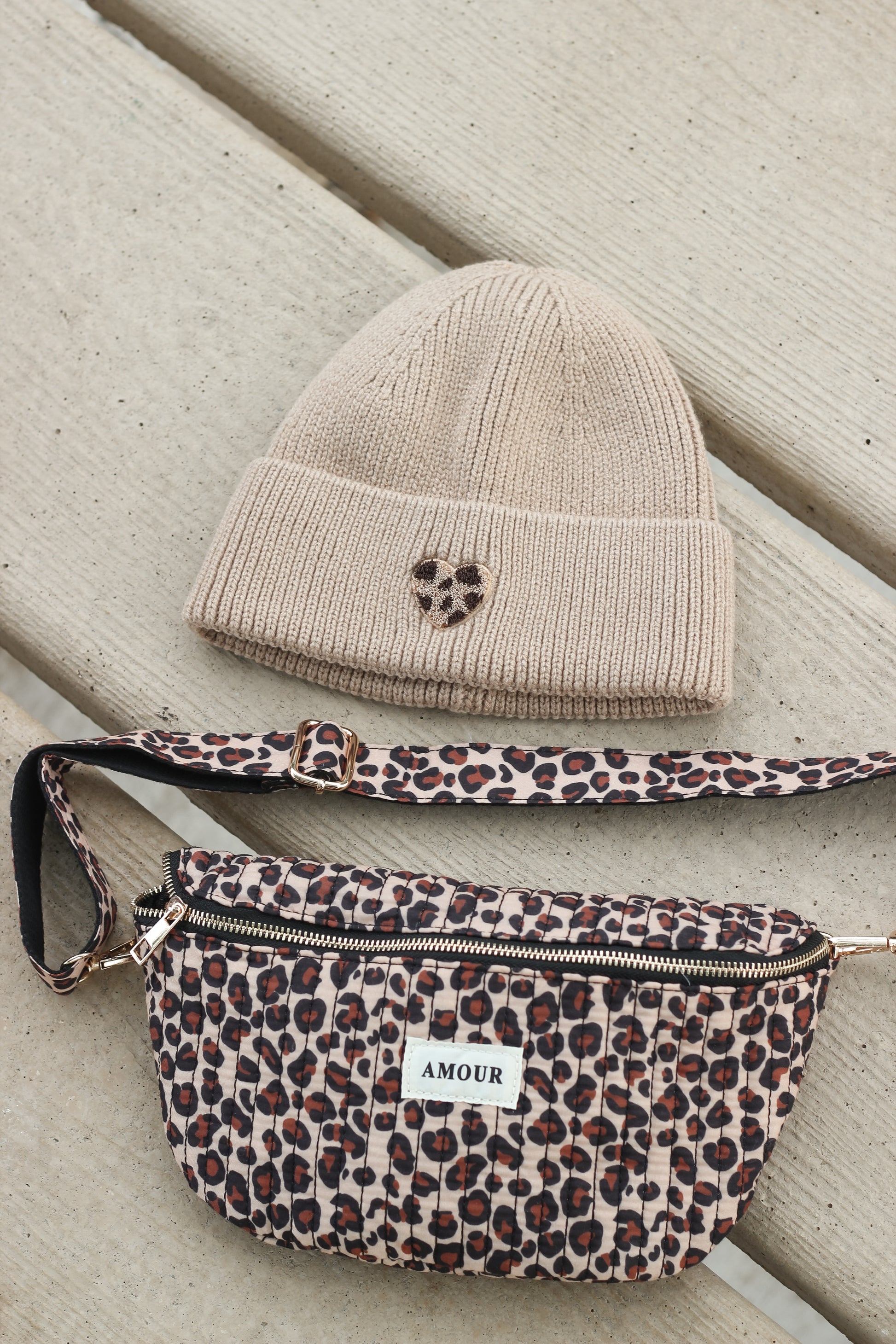 Bonnet tout doux pour adulte, avec coeur léopard sur le revers.