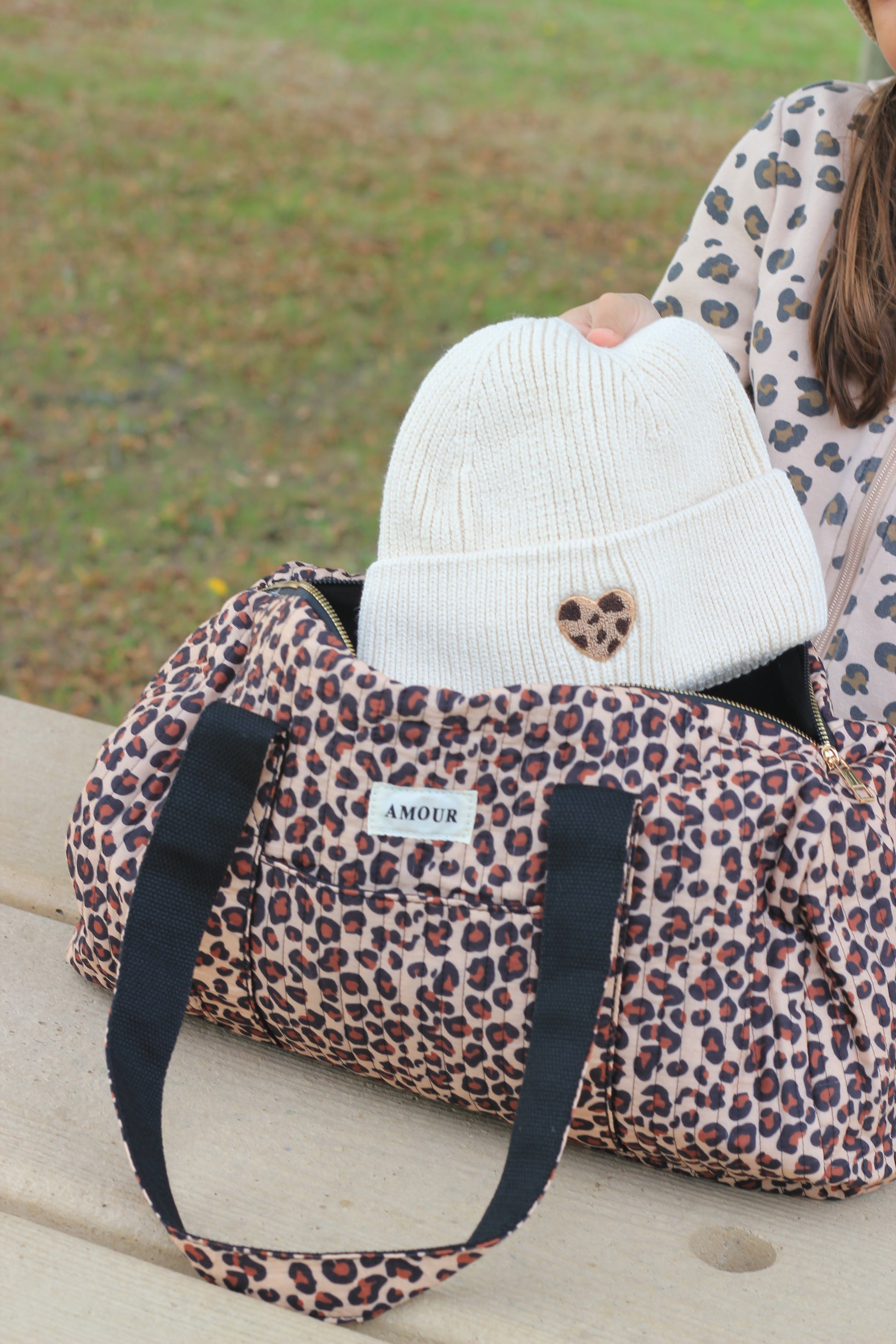 Bonnet tout doux pour enfant, avec coeur léopard sur le revers. Pour être bien au chaud cet hiver.
